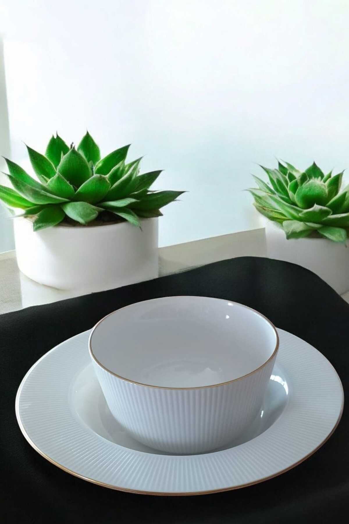 - 6 kişilik özel tasarımıyla, aile yemeklerinizde şıklığı ve konforu bir arada sunar.; - Fransa menşeli porselen malzemesi sayesinde dayanıklılık ve zarafeti ön plana çıkarır.; - Yuvarlak şekliyle klasik ve zamansız bir görünüm sağlar; her türlü sofra düzenine kolayca uyum sağlar.; - Modern tema ve stil anlayışı ile çağdaş dekorasyon trendlerini yansıtırken, geleneksel dokunuşları da unutulmaz kılar.; - Toplamda 12 parça içeren set, hem günlük kullanım hem de özel davetler için idealdir.; 6 Adet 13 cm Kase 6 Adet 24 cm yemek Toplam 12 Parçadır